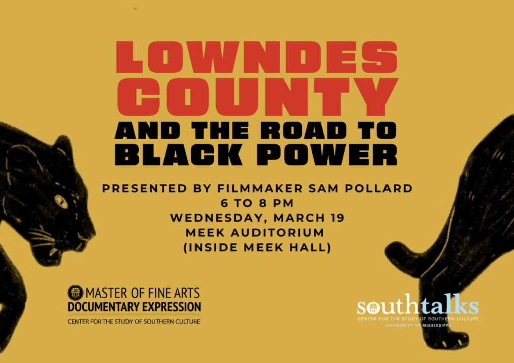 (Left) Sam Pollard sits nexts with SouthDocs MFA candidate Dr. Cassandra Hawkins and engage in a Q&A with the audience after his film screening. (Right) Event graphic for Lowndes County and the Road to Black Power screening.