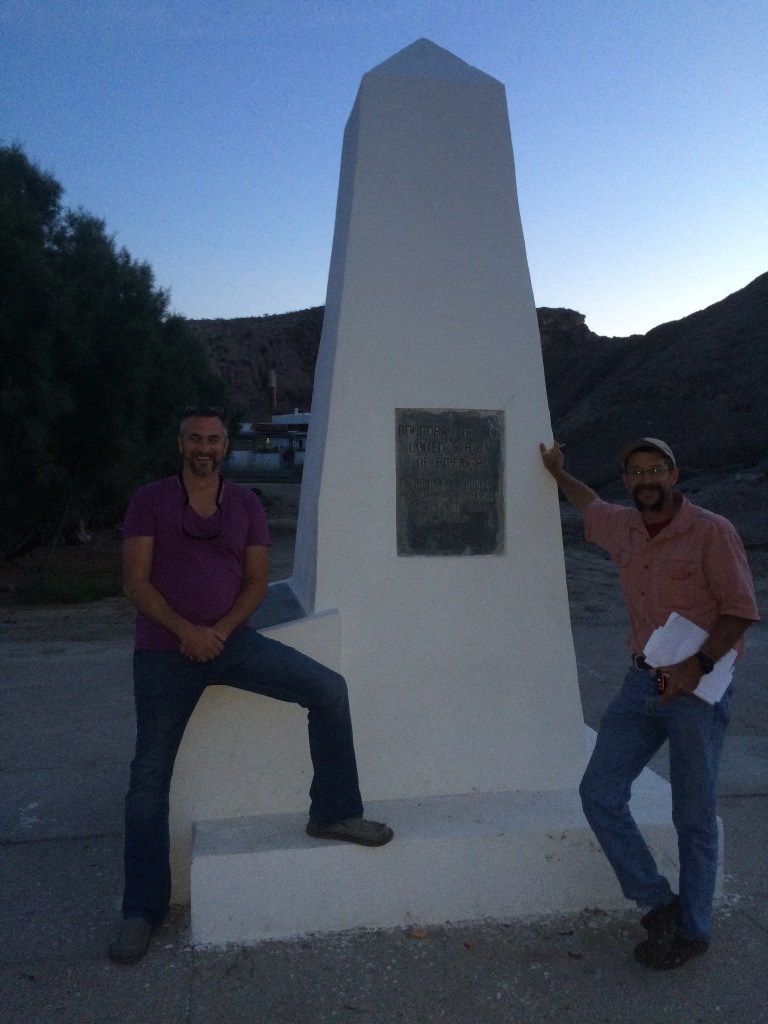 Sunday 10/26 – Got into El Paso after about 7 hours. It’s a long way across Texas. Located International Boundary Marker 1, which also marks the commencement point of our journey. Here’s Mark Hainds, Jack Chappell (one of Mark’s Tex-Mex compadres, a group of friends providing logistical support), and me at the marker.